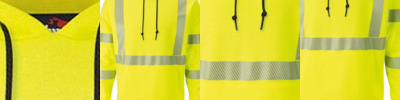 9 oz., Blended Fleece; Medium-weight fleece lined; Ansi class 3 certified; 2" reflective tape; Double-layered three-piece hood; Oversized front pockets; Knit cuffs and waistband; Nylon front zipper;
