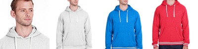 6.5 oz., 60% cotton 40% polyester single-dyed fleece; 1x1 rib yarn-dyed stripe cuffs and waist; off white drawcords; set-on pouch pocket;