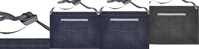 8 oz., 70% cotton, 30% polyester twill; 14" wide centre pocket with reverse contrast trim; combined pen pocket; metal eyelets secure 39" contrast fabric ties; neckband with gun metal buckle fastening for height adjustment; reverse contrast denim top centre pocket; 34" L x 28" W; Oeko-Tex® Standard 100 certified; WRAP certified;