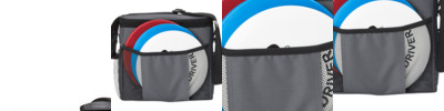 Set includes cooler bag with front disc pocket, side mesh water bottle holder and three golf discs: driver, mid-range and putter