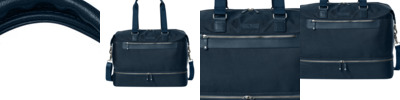 500D x 750D polyester with knitted fabric backing 420D polyester lining Genuine leather trim and details Front zippered pocket for decoration access Zippered main compartment with interior slip pocket and zippered pocket Zippered shoe compartment at base Dedicated padded laptop compartment Double leather-wrapped web handles Removable, adjustable shoulder strap with shoulder pad Leather feet at base Leather zipper pulls with Brooks Brothers logo rivet Exterior debossed Brooks Brothers leather label Trolley pass through with concealed zippered pocket Laptop compartment: 11'h x 15.75'w; fits most 17' laptops Dimensions: 14'h x 19.25'w x 9'd Capacity: 2,440 cu. in./40 L Weight: 3.5 lbs./1.6 kg Note: Bags not intended for use by children 12 and under.