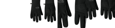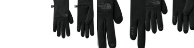 These water-repellent gloves are touchscreen compatible so there's no need to remove them to make a call or send a text. 94/6 recycled polyester/elastane bonded fabric with non-PFC durable water-repellent (DWR) finish Bonded soft shell back of hand with fleece backer Brushed tricot lining Silicone gripper dot print on palm for better grip Etip functionality works with touchscreen devices Nose wipe Pairing clip helps keep gloves together when not being worn Matte The North Face logo on top of glove Medium: 8 to 8.5-inch hand circumference Large: 9 to 9.5-inch hand circumference X-Large: 9.5+-inch hand circumference
