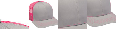 65% polyester, 35% cotton crown and visor; 100% nylon contrast mesh back panels; 6-panel, structured, rounded, pro mid-profile; Slightly curved visor; Contrast stitching on visor and front panels, matches back panels; Back closure matches back panels; Eight rows of stitching on bill;