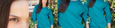 - Raw-edge seams on raglan shoulders, side gusset panels, pocket and waistband